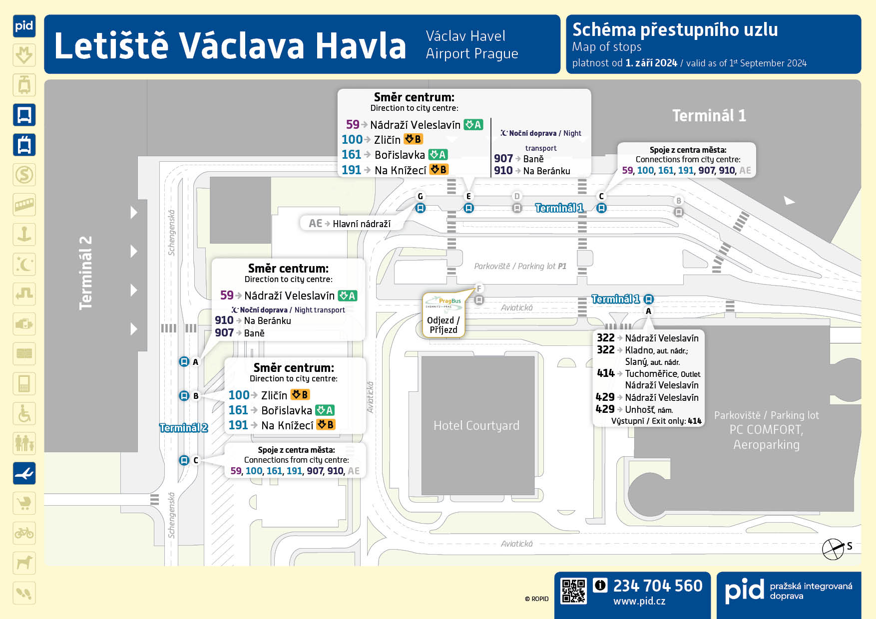 | Václav Havel Airport Prague Terminál 1, Platforma F (jen výstup) | 07:45 hod. | 14:45 hod. |